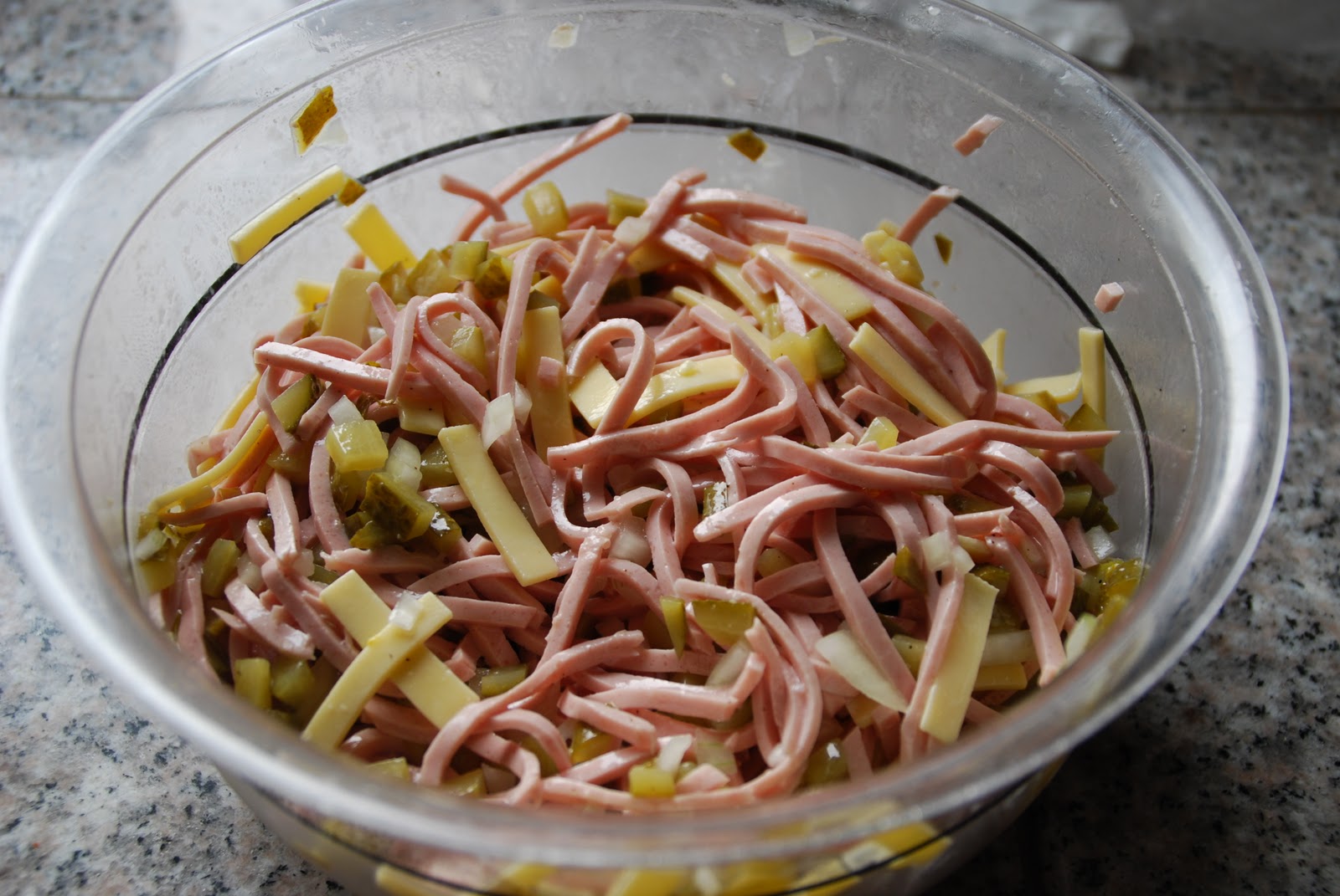 Wurst, Käse und Gurken in dünne Scheiben schneiden. Ich hatte hier schon fertige Lyoner-Wurststreifen vom Metzger, Ihr könnt aber nätürlich die Wurst nehmen die Euch schmeckt. Wer es mag kann auch Krakauer dazugeben. Käse habe ich Butterkäse genommen, aber auch hier könnt Ihr den Käse nehmen der Euch am Besten schmeckt.