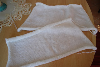 Er ist recht schlicht und wird später durch den Häkeleinsatz etwas eleganter…laut Anleitung wird dieser mit doppeltem Faden gestrickt, aber ich muß sagen, dass ich ihn etwas steif dadurch finde…Ich habe auch nicht dafür den empfohlenen DROPS Safran sowie DROPS Cotton Viscose Garn verwendet. Mein Garn ist ein schlichter weißer Perleffektgarn!