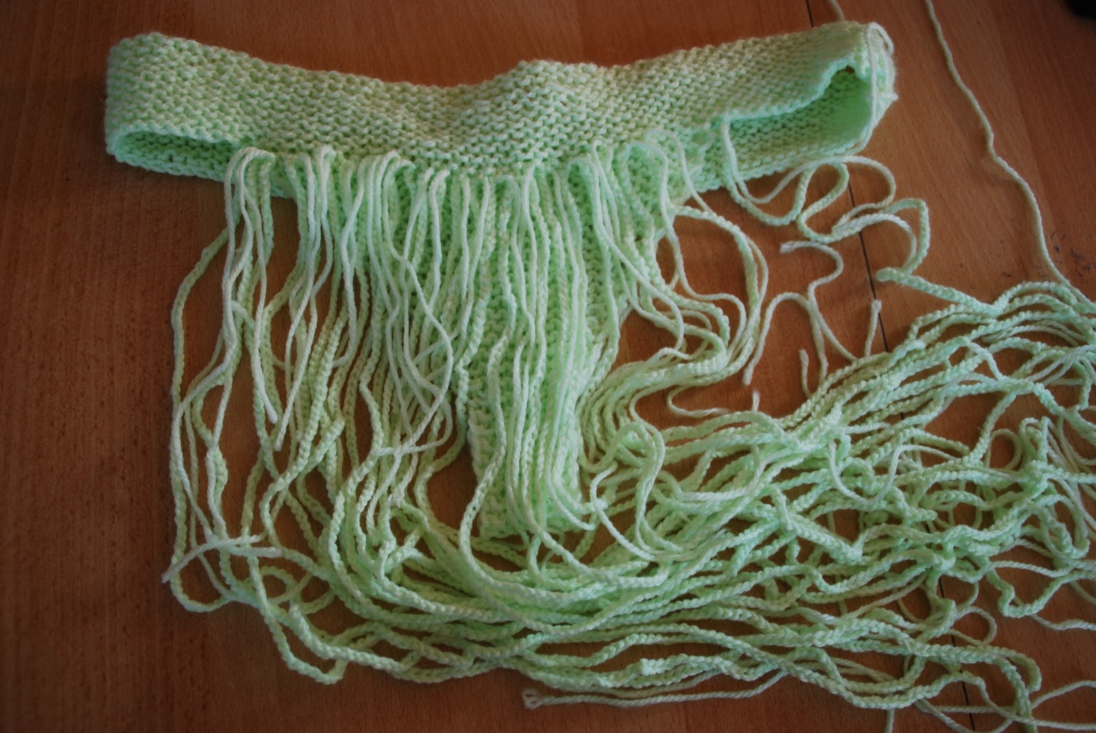 Die Fransen werden zwar laut Anleitung aus einzelnen Fäden angeknüpft, da ich aber ein standart Garn verwendet habe, hatte ich die Fransen als Luftmaschenkette in unterschiedlichen Längen gehäkelt!