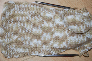 Ein einfaches re/li Muster….am Anfang 6 Reihen Kraus re, dann ab der 7. R = 1 RM, 3 Kraus re, 16 glatt re, 3 Kraus re, 1 RM => 24 Maschen auf der 8er Nadel.