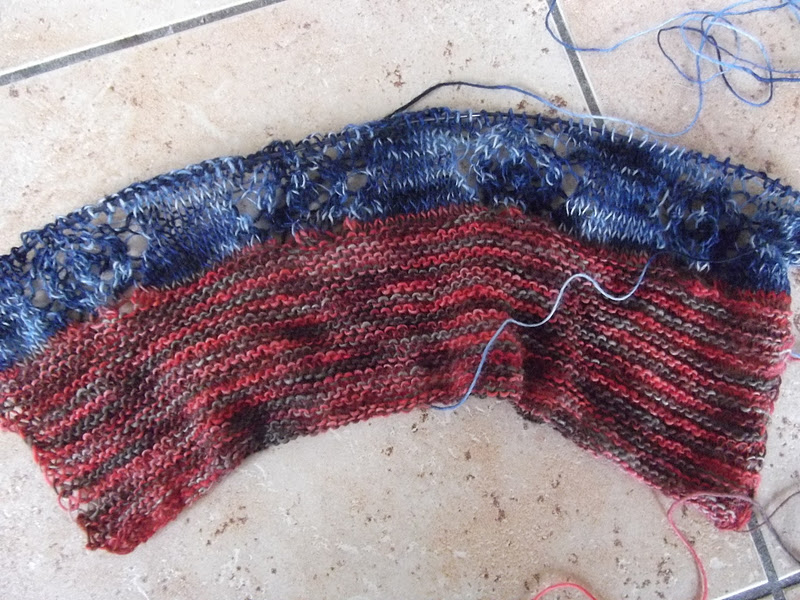 Von dem roten Lacegarn habe ich genau die Hälfte genommen und die ersten Reihen gestrickt, die andere Hälfte kommt dann natürlich als Abschluß, sobald das blaue Lacegarn vollständig aufgebraucht ist!